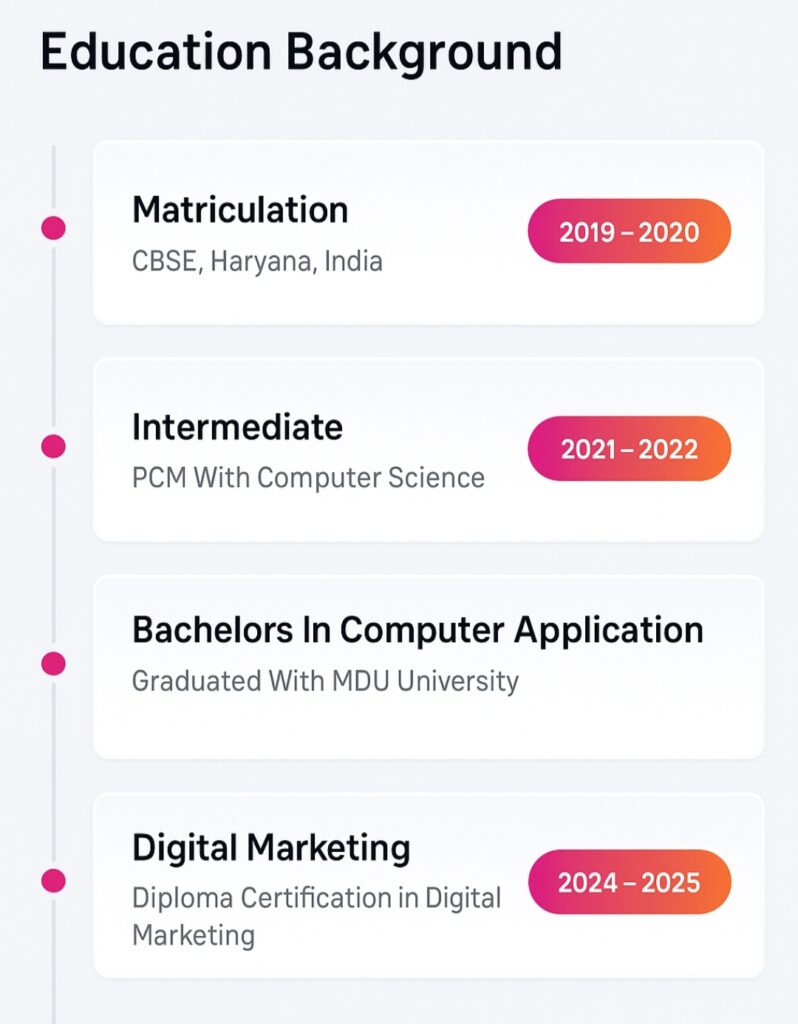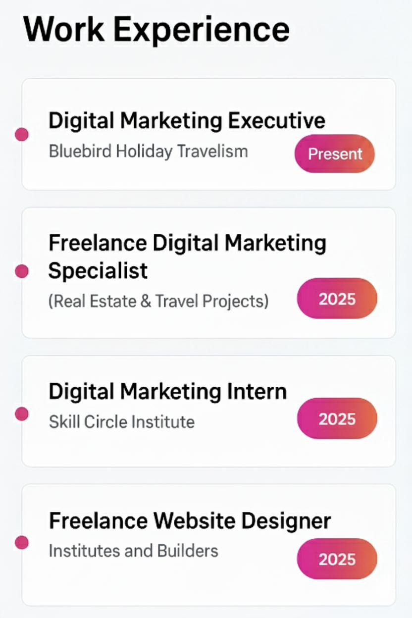 I’m a certified digital marketer skilled in Google Ads, Meta Ads, SEO, and Analytics. I’ve worked with Real Estate, IT, and Travel businesses to create high-converting campaigns that bring in leads at a low CPL. My strength lies in audience targeting, remarketing, and conversion tracking with GA4 & GTM. I’m passionate about helping businesses grow by combining creativity with data-driven strategies.